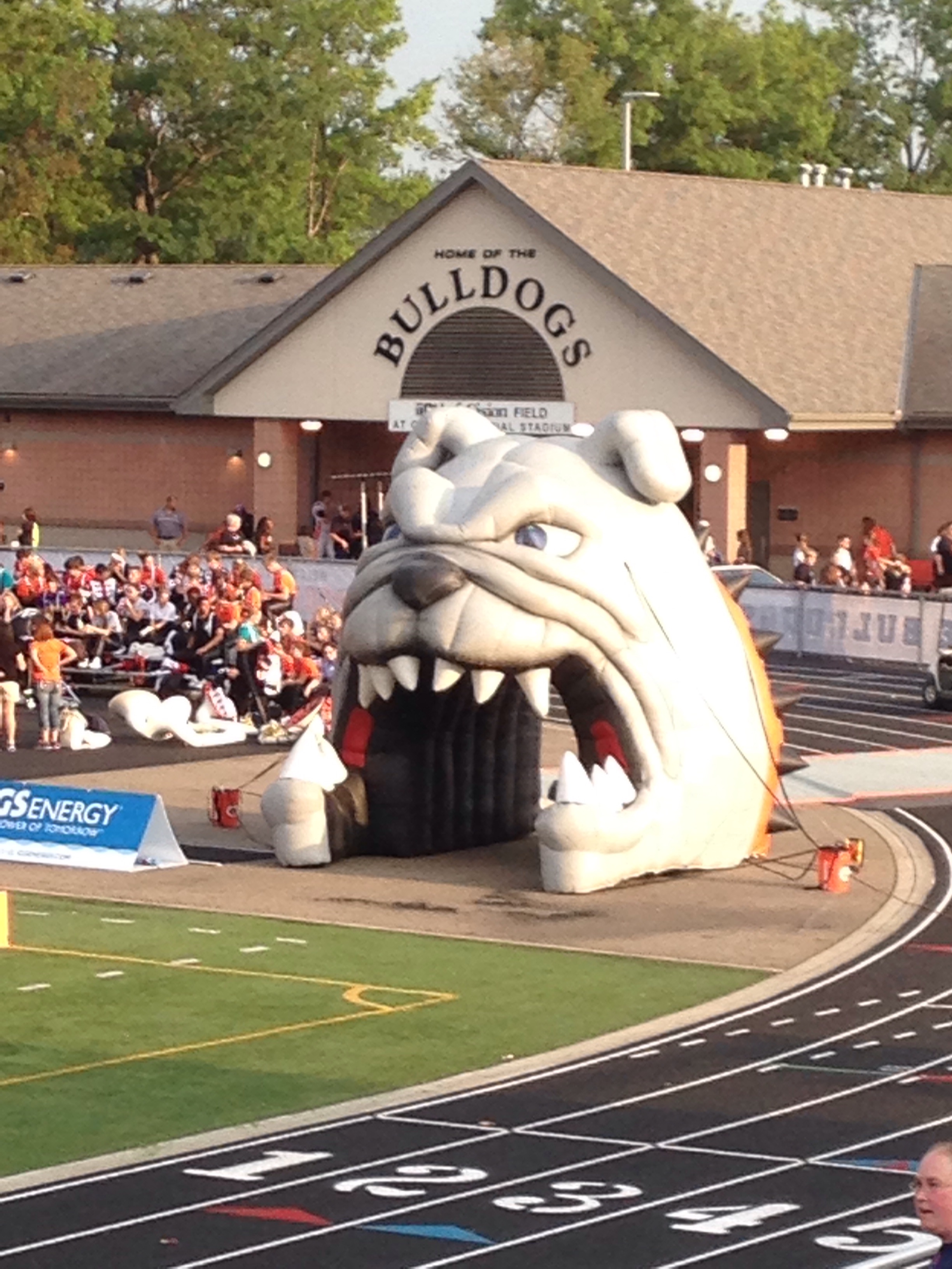 So there I sat, in my jeans, t-shirt, & flip flops, obviously way out of my element at “Infocision Field”. Yes, that’s right: our high school football field has a sponsor. A SPONSOR. We also have a very fancy Bulldog: