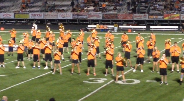 Look how cute my kid is! 😉 [Side note: Hats off to the band directors at GHS who, when learning the temp was supposed to be in the 90s with a chance of rain, decided to let the kids wear their summer uniforms. That way, if the rains came, they’d wear their raincoats over shorts instead of wool. It doesn’t happen often, but occassionally common sense prevails. We’re not in a professional band; this is high school. No heat stroke for them and no off-the-clock nursing for me, thanks!]